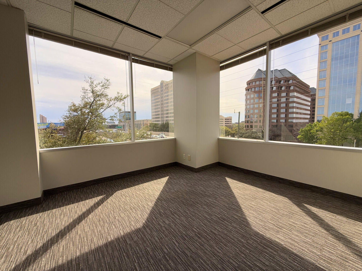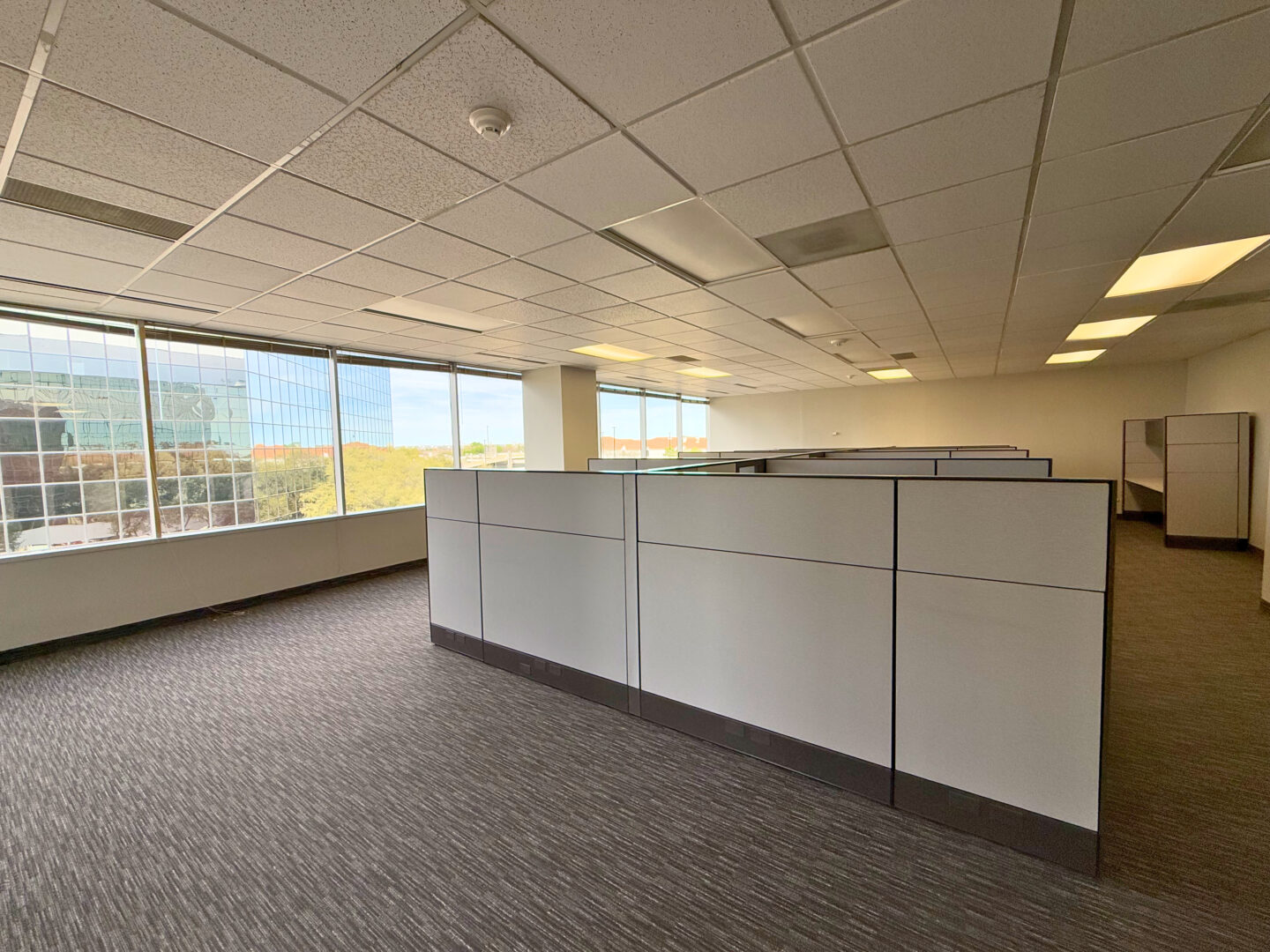 This office hosts 3 private offices and a large open area in the center of the space, along the exterior glass that is perfectly suited for work stations. |