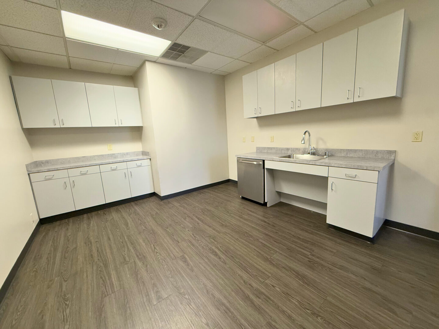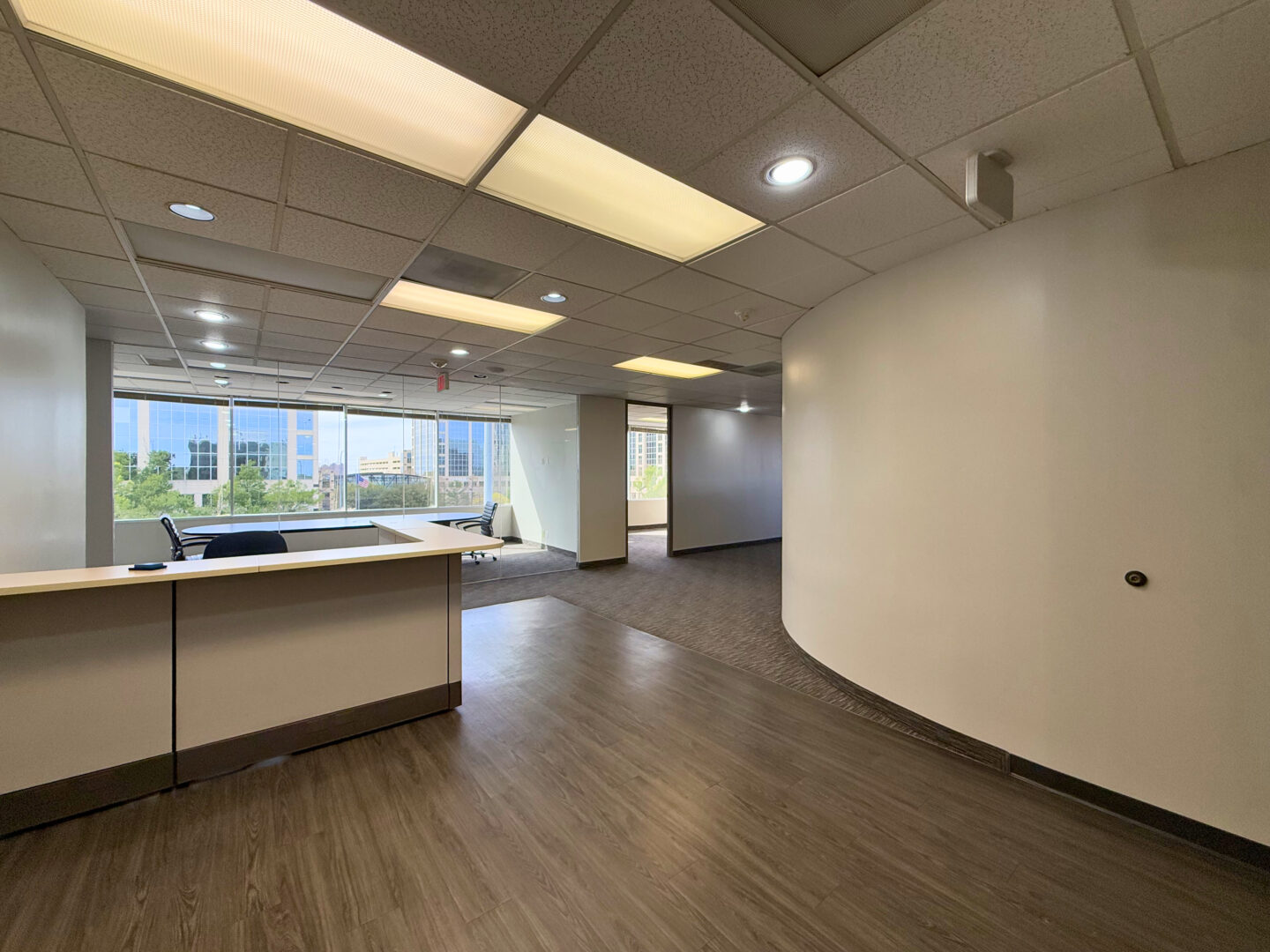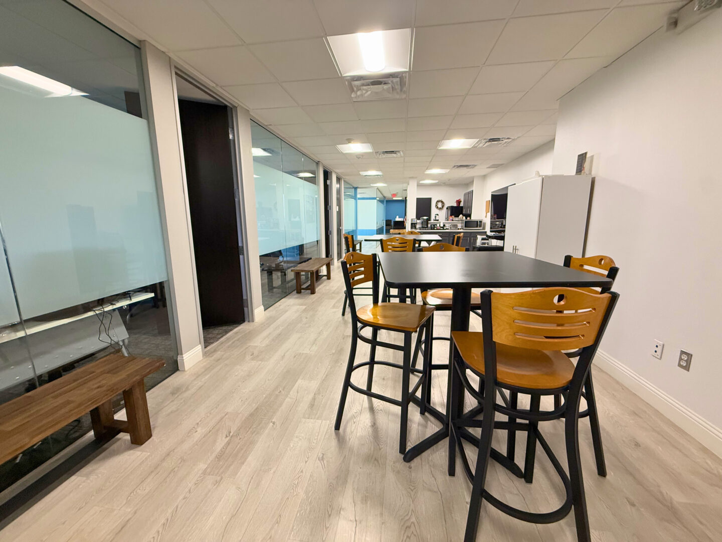 Our versatile office suite featuring an open reception area, seven private offices for focused work, a spacious break room with a sink, an open collaboration area, and ample storage in a large supply closet. |