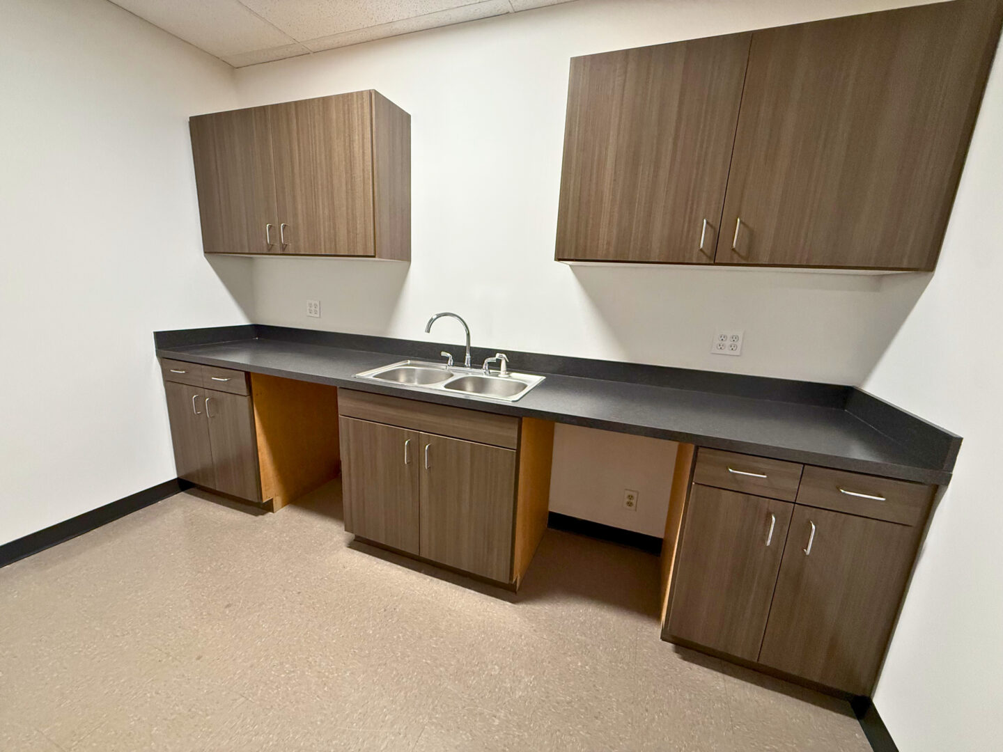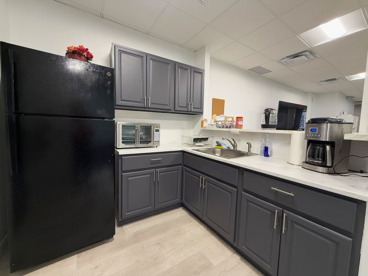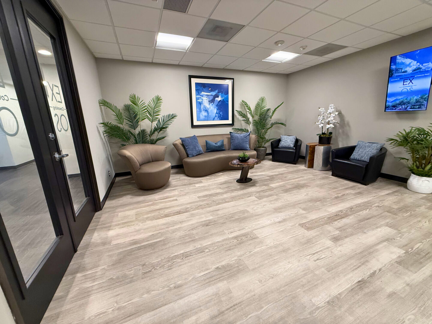 Our versatile office suite featuring an open reception area, seven private offices for focused work, a spacious break room with a sink, an open collaboration area, and ample storage in a large supply closet. |