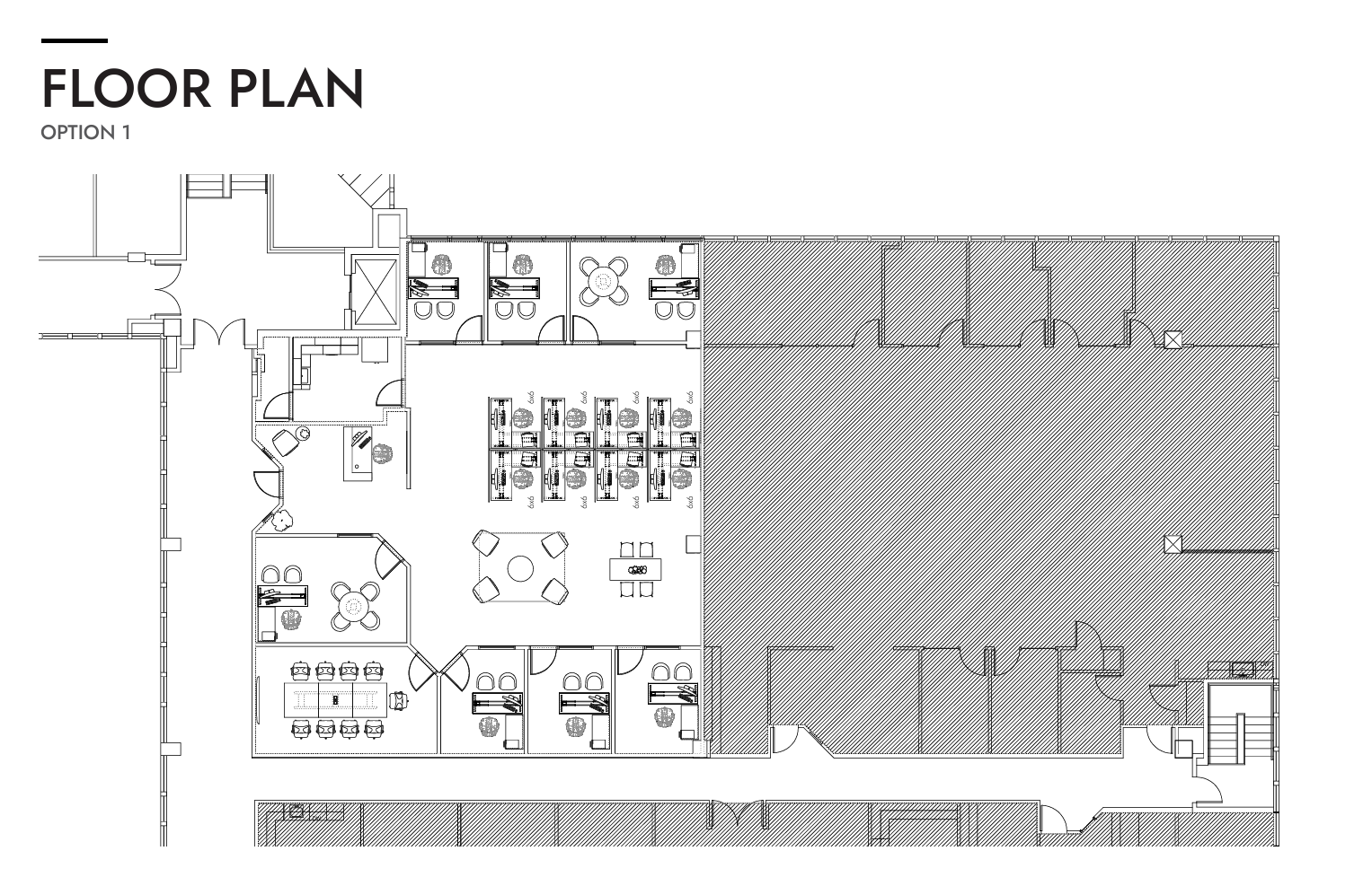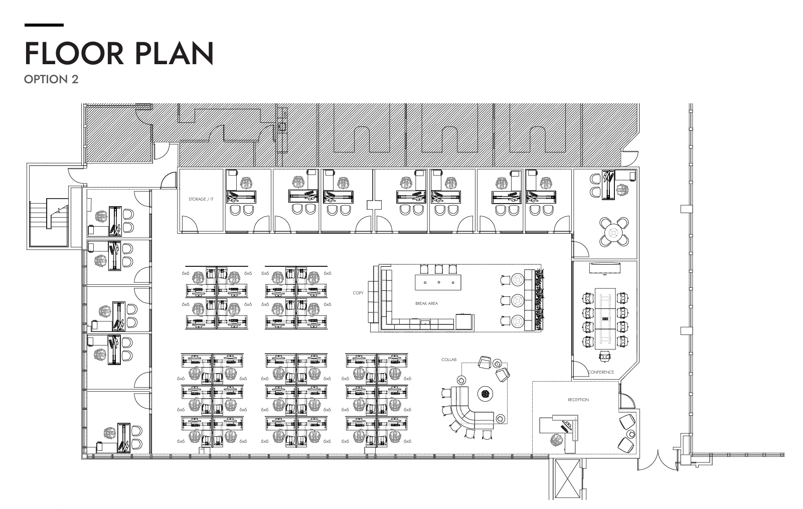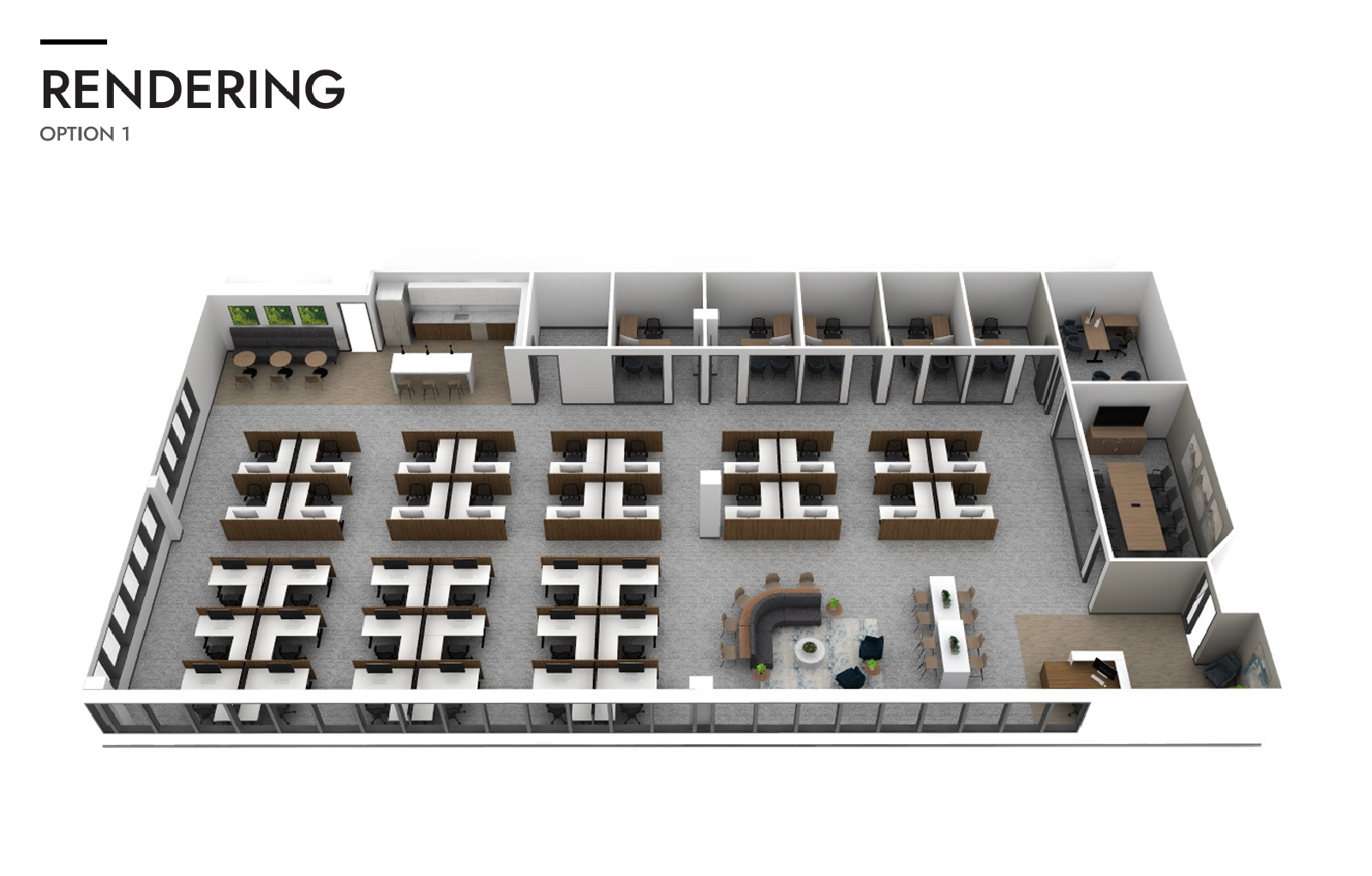 Versatile office space with three exterior-facing offices, three interior junior offices, a conference room, a kitchen, a collaborative bullpen, a reception desk, and an executive office. See how this suite can foster a team-centric environment with its unique layout. |