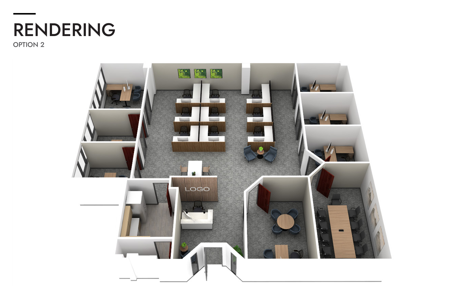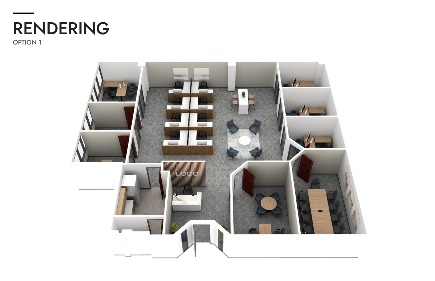 Dynamic suite with multiple executive offices, a conference room, storage, a break room/kitchen, and an open area for workstations. |